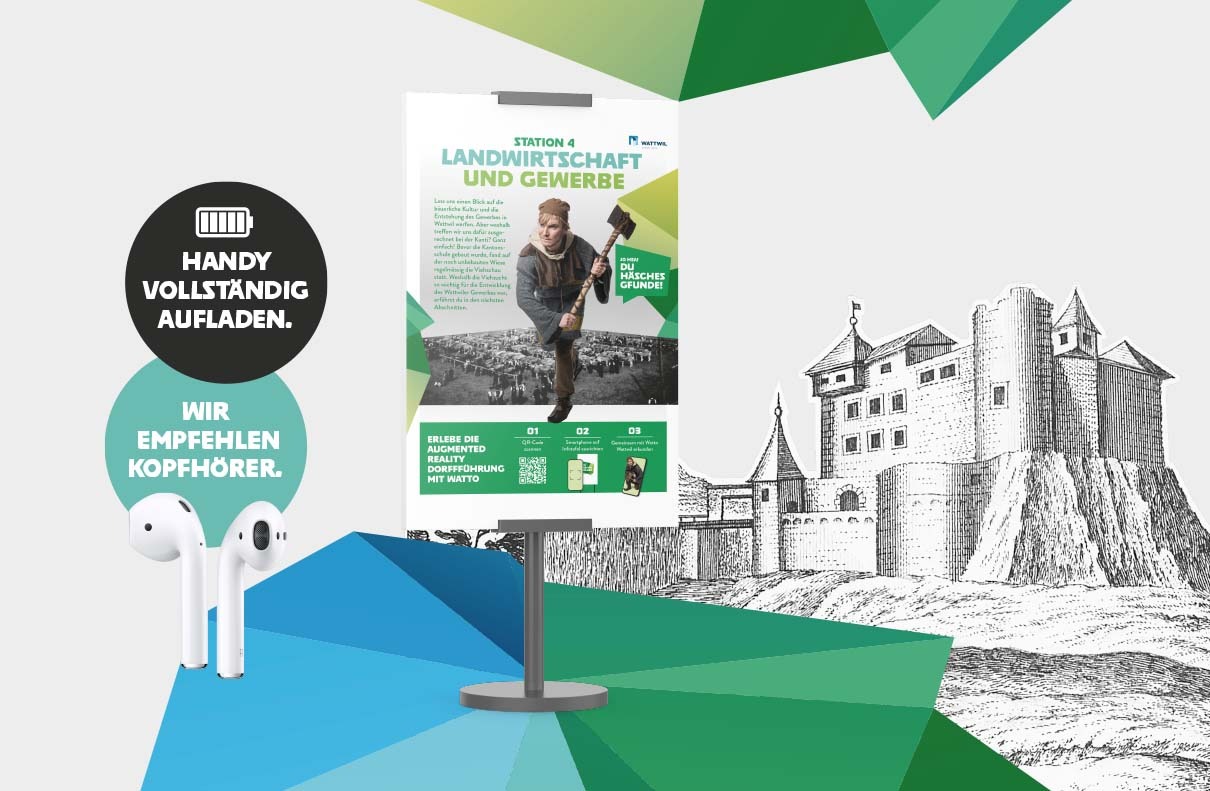 So werden historische Fakten zum spannenden Erlebnis. Per Smartphone – ohne eine spezielle App installieren zu müssen – aktivieren die Teilnehmenden einfach den QR-Code der Infotafeln, die an neun Standorten in Wattwil verteilt stehen. Und schon erzählt Watto in kurzweiligen Videosequenzen die Geschichten von damals: von den Grafen von Toggenburg, über die Auseinandersetzungen mit Fürstäbten und fremden Mächten, über die industrielle Vergangenheit, aber auch von Wattwils Tradition als Bildungsstandort und von Zukunftsvisionen.