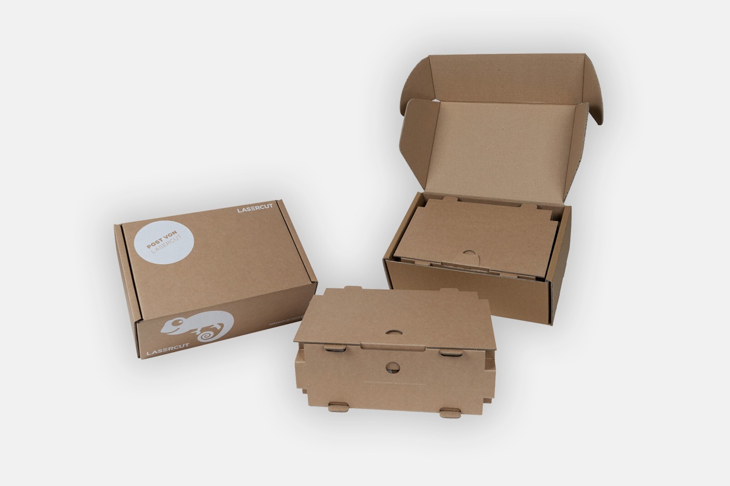 Der Versand hochwertiger Präzisionsteile stellt hohe Anforderungen an die Schutzfunktion der Verpackung. Die vier Primärverpackungen können modular in die Umverpackung gesetzt werden, bilden ringsum Hohlräume und damit eine Pufferzone, die vor Versandschäden optimal schützt – der Inhalt wird schwebend gelagert.